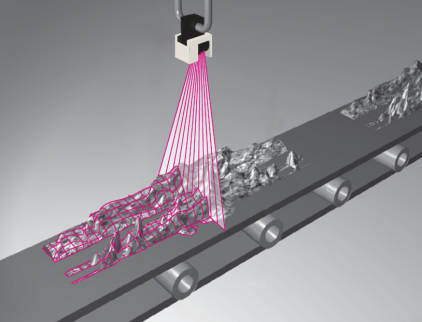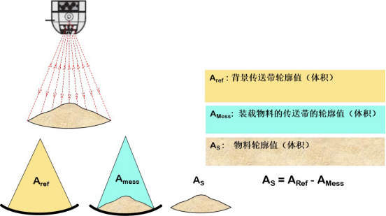 传感器首先扫描空皮带或传输载体的形状,并记录下来,当有散料通过时,得到实时的轮廓数据,用空载时的轮廓减去载荷时的轮廓, 就能得到该瞬间的截面面积,从而得到体积和质量,当连续不断的测量运动皮带上物体的实时轮廓时,就能得到连续的体积和质量,如图1及图2所示。